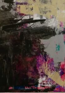 In addition to finely detailed works, Nicholas has also experimented with much more gestural compositions. In Purple Rabbits, he uses a “paint over” technique, applying large swaths of color over a seemingly complete canvas. Rorschach-like forms emerge from the background, suggesting a pair of rabbits (according to Nicholas). Like the work of Franz Kline, works from these series evoke unconscious associations, sometimes unexpected, and the ultimate interpretation is up to the viewer.